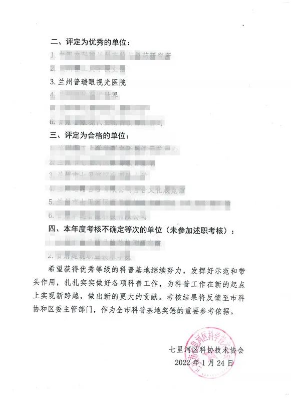 1月18號,蘭州普瑞眼視光醫(yī)院作為市級科普基地之一參加了蘭州市七里河區(qū)科學技術協(xié)會2021年科普基地年度考評。在經過了審核資料提交評議及2021全年工作匯報環(huán)節(jié)后,通過考核組的綜合審核評估,蘭州普瑞眼視光醫(yī)院在本次考核中榮獲優(yōu)秀等次!