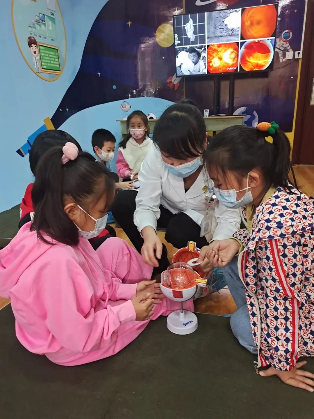 在道具展示區(qū)探索光學(xué)神奇,在科普課堂里聆聽愛眼護眼常識,張曉艷主任通過趣味互動的方式,帶領(lǐng)孩子們認識眼科基礎(chǔ)知識,并通過科普宣講、現(xiàn)場演示等形式,使孩子們學(xué)會保護眼睛的正確方法,感知近視形成的原因,理解近視矯正的原理,對近視眼的危害和如何預(yù)防近視等概念有了更深刻直觀的認識。