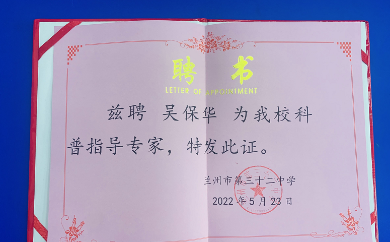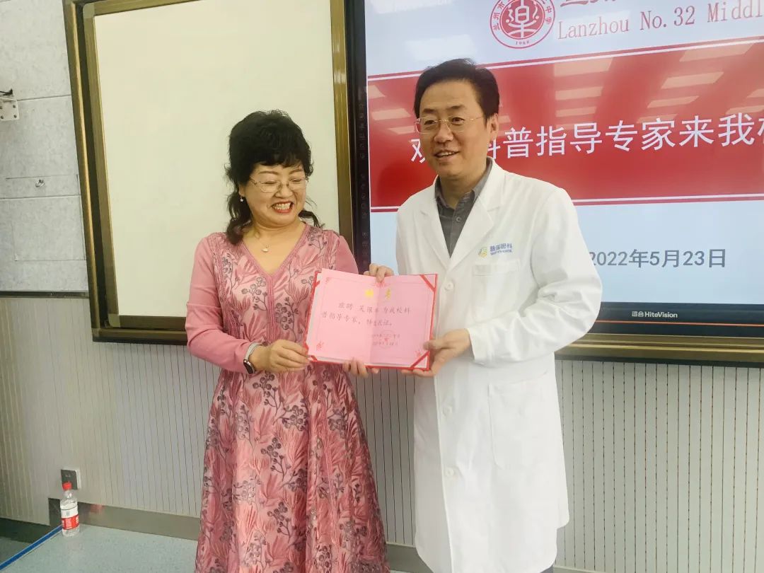 為落實“十四五”以來我國關(guān)于防控兒童青少年近視的相關(guān)指示和實施指南,切實履行蘭州地區(qū)眼科專家人才工作站及蘭州市科普基地的平臺職能,推進兒童青少年近視防控工作,2022年5月23日下午,蘭州優(yōu)秀科技工作者、金城負(fù)責(zé)人科普專家、蘭州普瑞眼視光醫(yī)院院長吳保華來到蘭州市第三十二中學(xué),為在校師生進行了一場翔實生動的愛眼科普課程。蘭州市第三十二中學(xué)滕立玲校長為吳院長頒發(fā)了科普指導(dǎo)專家聘書。