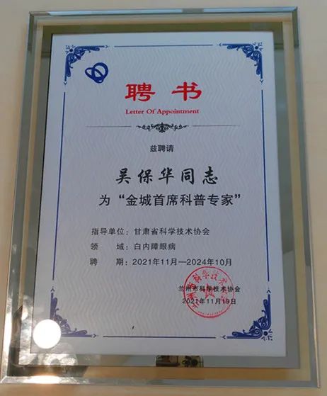 作為蘭州市醫(yī)療領(lǐng)域青年專家、首批“金城名醫(yī)”及“優(yōu)秀科技工作者”,吳保華院長以提升區(qū)域百姓視覺質(zhì)量為己任,帶領(lǐng)團隊發(fā)揮專業(yè)優(yōu)勢,致力于眼健康科普及眼科事業(yè)的發(fā)展,對提高大眾的眼健康意識有重要影響。此次榮膺“金城負責人科普專家”,他表示作為一名眼科領(lǐng)域的科普工作者,必將帶領(lǐng)團隊擔當使命職責,在眼病與預防方面做出探索和創(chuàng)新的同時,針對全年齡層眼健康問題,構(gòu)建多維度、多層次、多方面的健康科普體系,提升團隊科普服務(wù)能力,為推動我市科普事業(yè)發(fā)展提供支持。