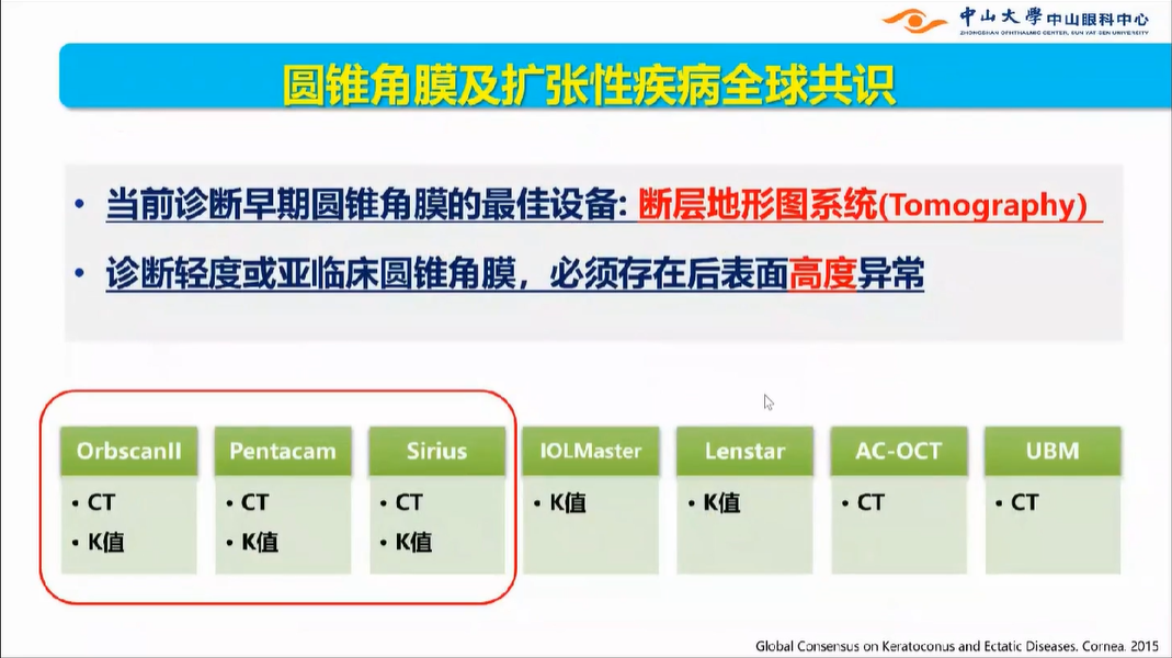 會上,中山大學(xué)中山眼科中心楊曉教授分享了《圓錐角膜的診斷和進展》。楊曉教授講道,近年來隨著屈光手術(shù)的進展和知識的普及,對于兒童角膜地形圖檢查的廣泛帶動角膜相關(guān)研究進展迅速,導(dǎo)致診斷標準亦有更新改變。她詳細介紹了圓錐角膜的定義、流行病特征、病因、種類、臨床表現(xiàn)及分期,隨后強調(diào)了圓錐角膜診治的必要性,提及因檢查技術(shù)發(fā)展所帶來了圓錐角膜診斷思路的改變,并對早期圓錐角膜診斷設(shè)備斷層地形圖系統(tǒng)進行了多方面介紹,梳理了圓錐角膜的新進展,為青少年兒童圓錐角膜的診斷提供了新思路。