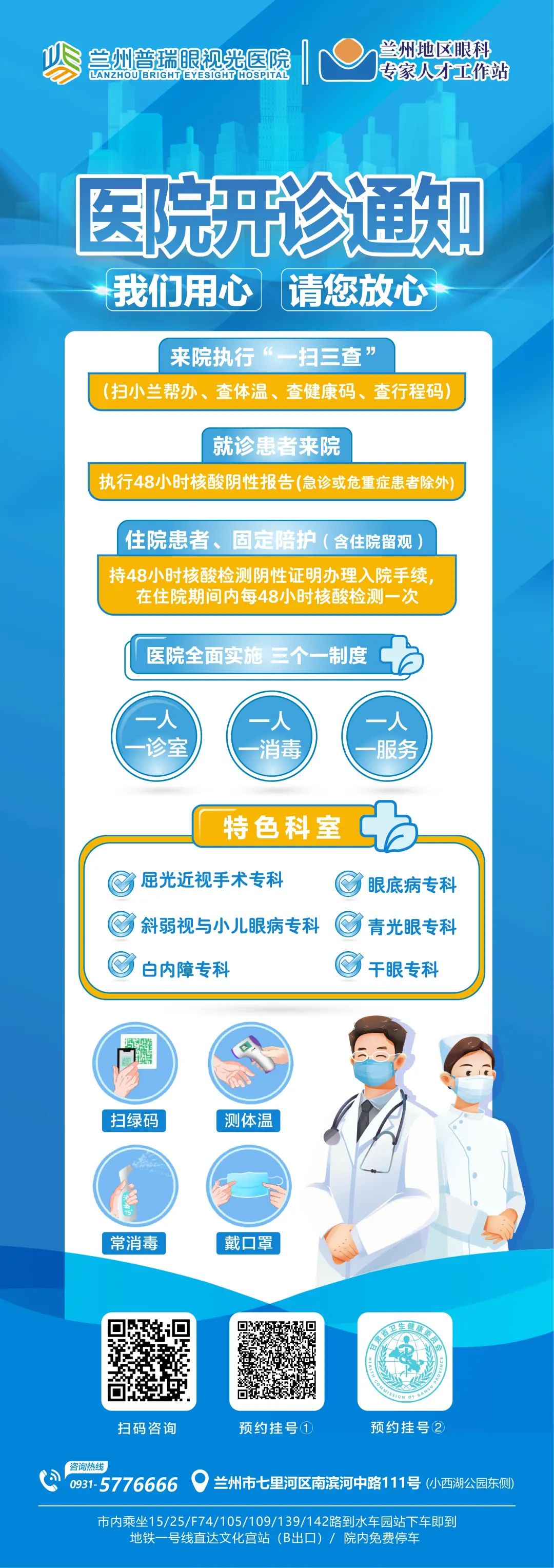 根據(jù)國務院聯(lián)防聯(lián)控機制綜合組《新型冠狀病毒肺炎防控方案(第九版)》和省、市衛(wèi)健委相關要求,在做好新冠疫情常態(tài)化防控的同時,為加強醫(yī)療服務管理,維護合理醫(yī)療秩序,保障轄區(qū)居民就醫(yī)需求,蘭州普瑞眼視光醫(yī)院已多方面消殺工作,現(xiàn)正式開診,請廣大群眾放心來院就醫(yī)。